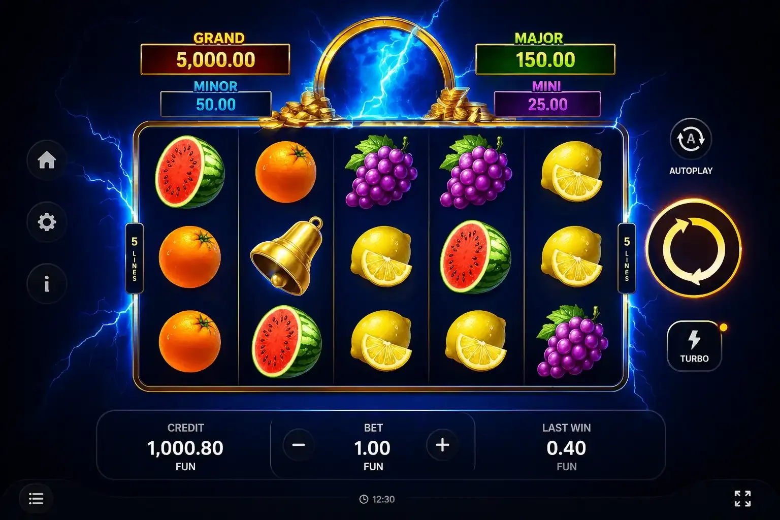 Slot машинасы интуитивті интерфейспен жабдықталған. Экранның төменгі панелінде барлық басқару элементтері топтастырылған. Сол жақта ставка реттеу батырмалары, ортада SPIN және AUTO SPIN батырмалары, ал оң жақта ойын ақпараты мен параметрлер орналасқан.
